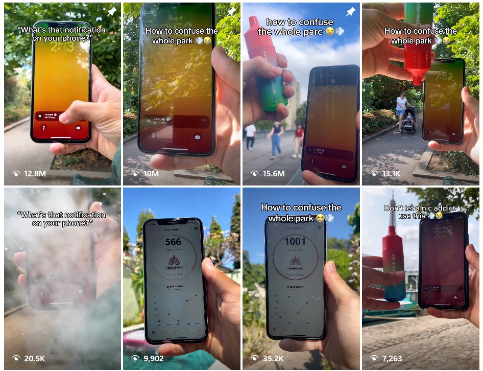 Outdoors (park, landmarks) + vape and phone screen side-by-side in matching color scheme + text hook