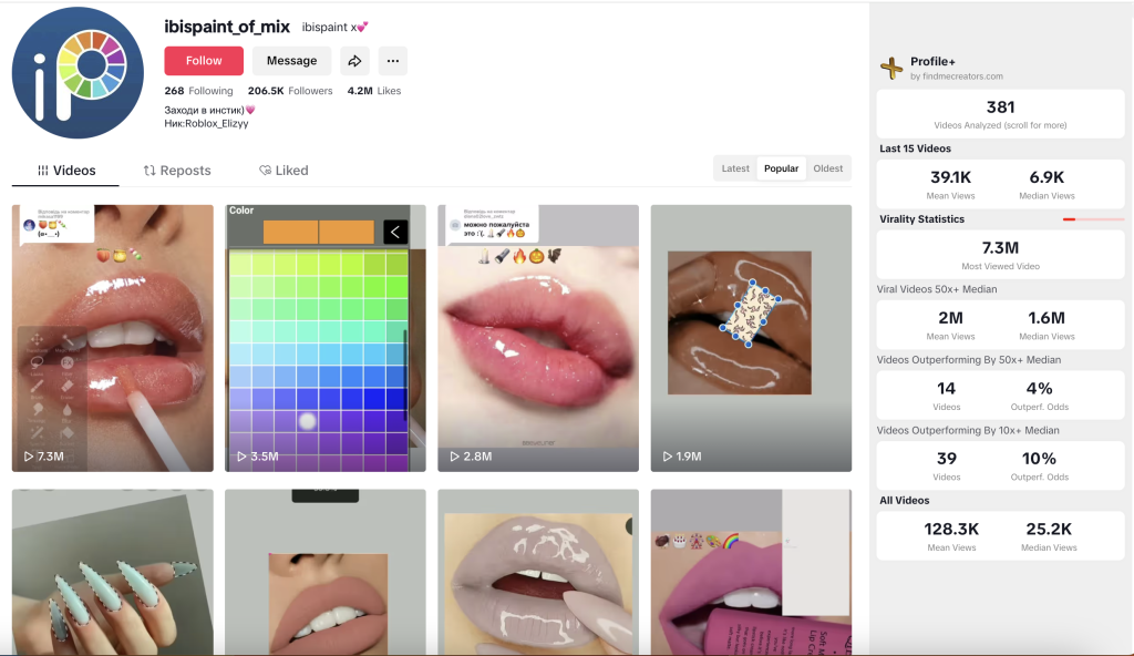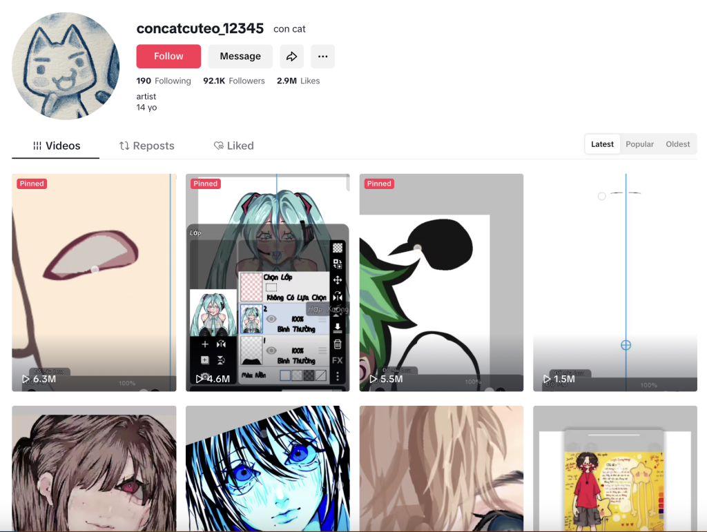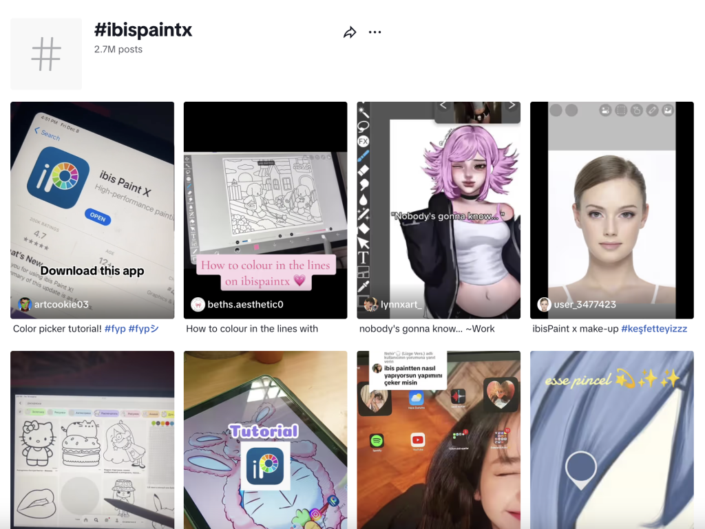 ibis could have potentially been incentivizing app users to create content through in-app nudges and/or by recruiting content creators from their user base.Most of them are young, like this 14-year-old, tt@concatcuteo_12345, who has made 8+ viral videos using IbisPaintX.