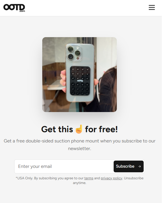 The page is linked to a website (ootd.com), a media fashion business. There’s an immediate CTA to subscribe to their newsletter, including a free gift for anyone who subscribes (US only).