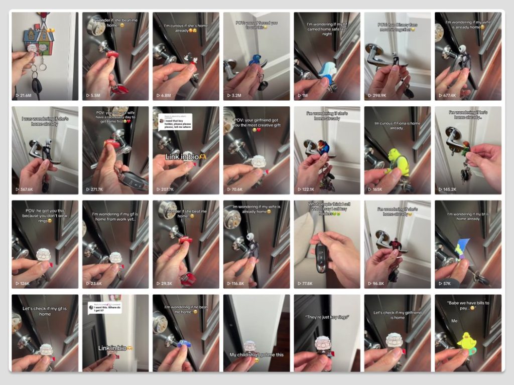 Every keychain is recorded 5 to 10 times and posted with a different hook.