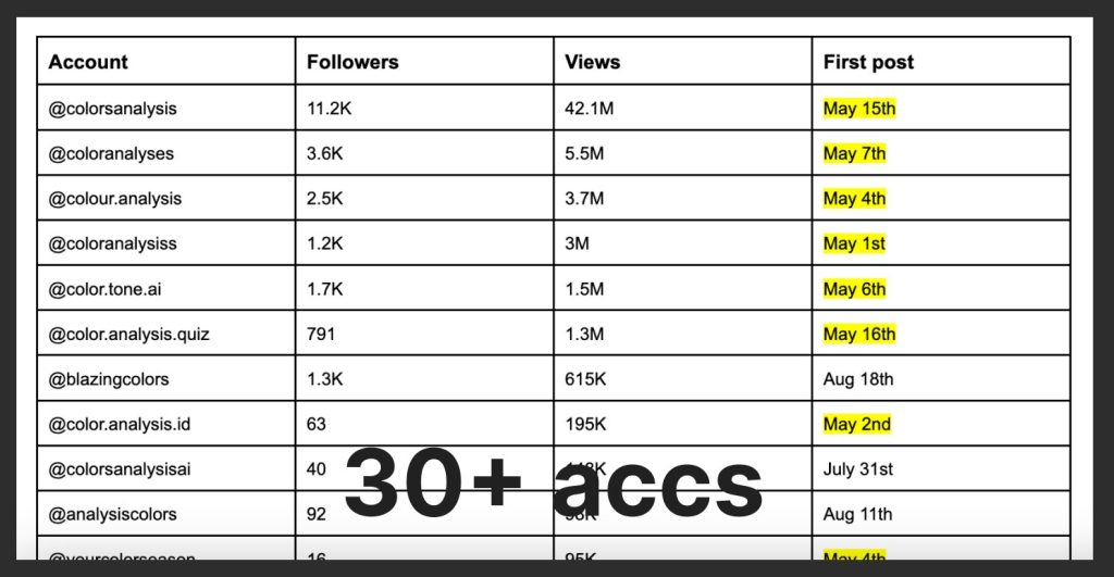 Color Analysis AI was released in April. By May had 30+ TikTok accounts (@colorsanalysisai,@coloranalyses…) running the same content – and over 50M views. Here’s how: