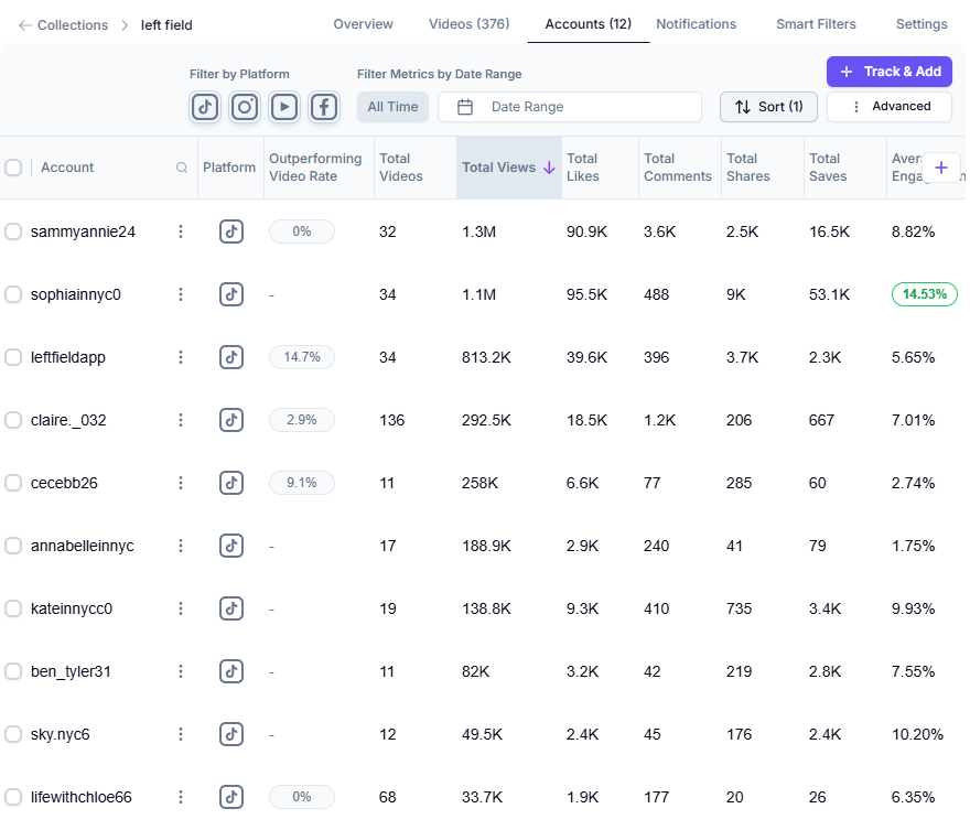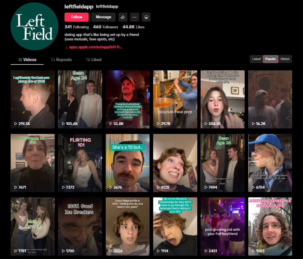 tt@leftfieldapp has a somewhat random mix of formats, none have gone crazy viral yet. In total, it secured 813K views.