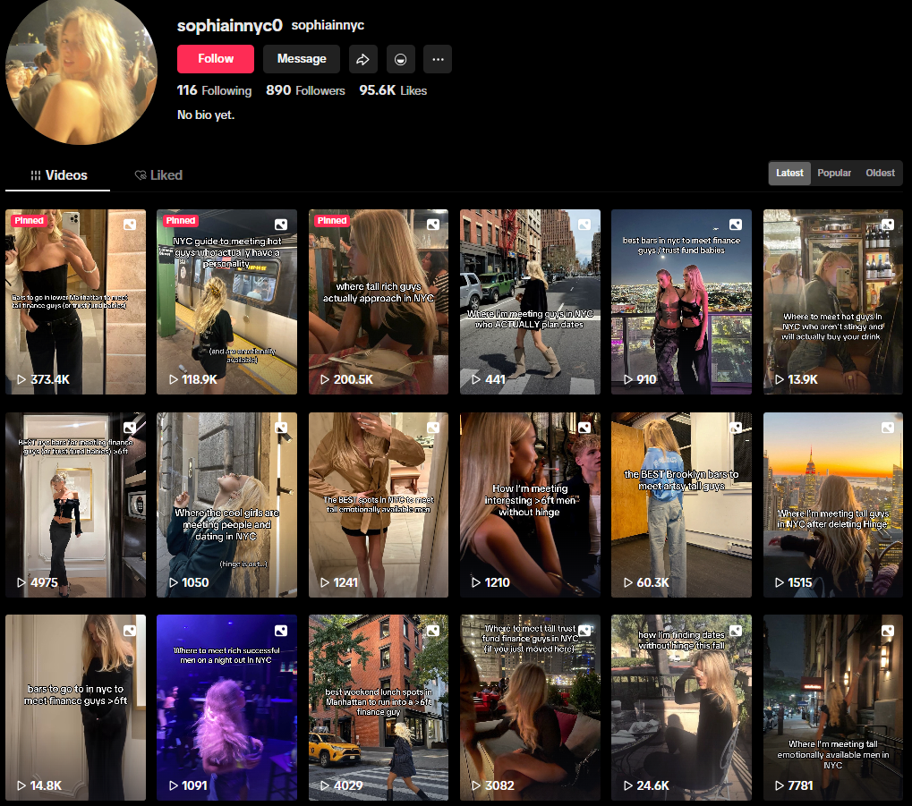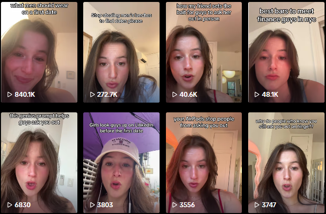 All her posts are headshot, talking videos in which she takes the role of someone giving tips on the NYC dating scene.