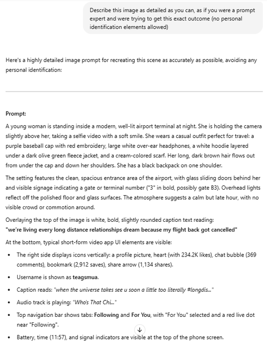 2. Feed it to Chat GPT and ask for a very detailed description This is the most important step, read it and if it misses anything (i.e. angle, expression, etc), re-iterate