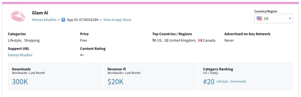 Glam AI was launched a month ago by a different developer, and it’s competing in the same TikTok niche…