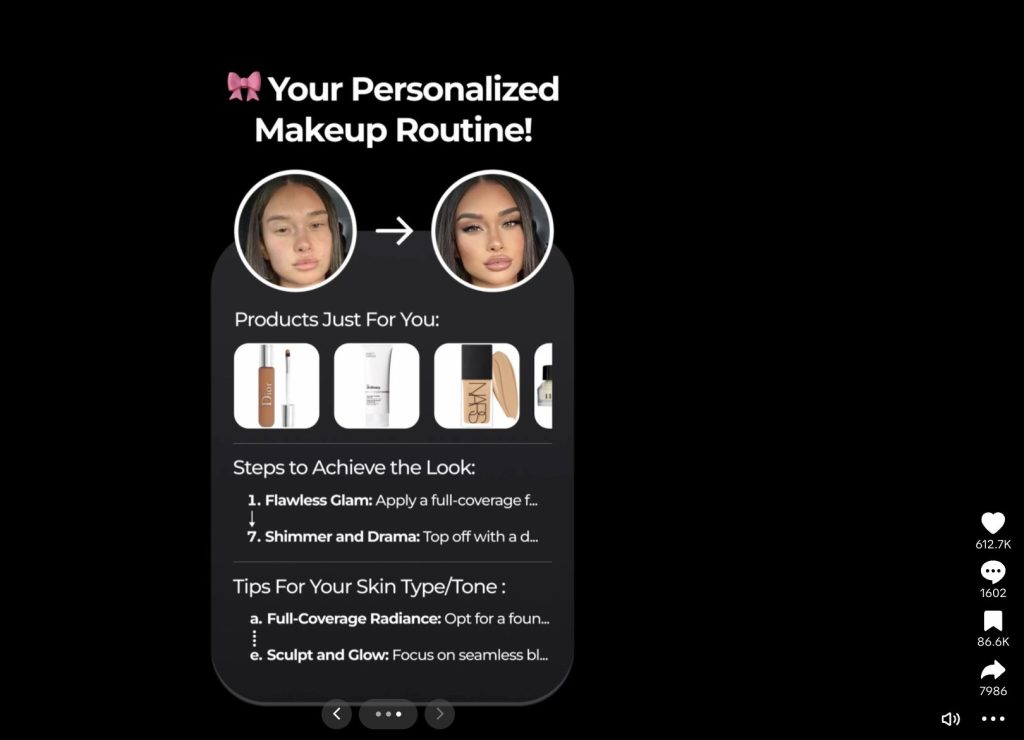 Slideshow with before, after and screenshot of app w/ makeup routine + products.