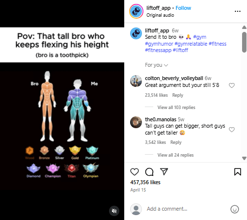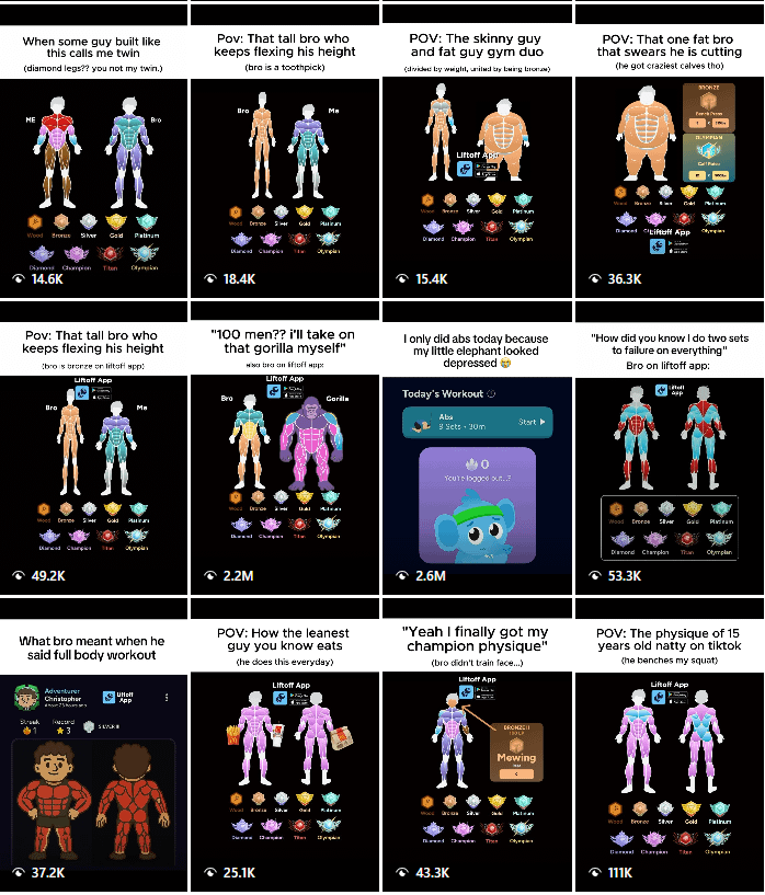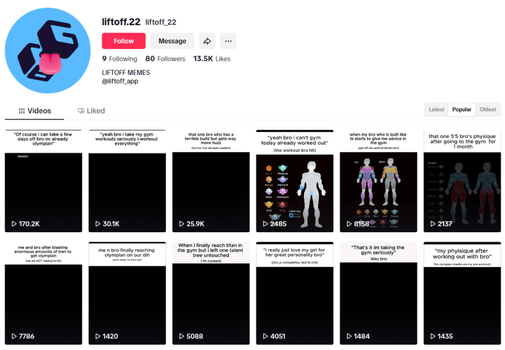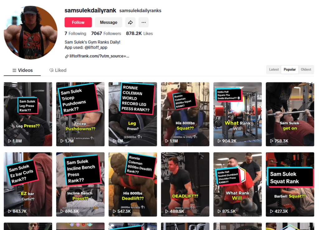 While keeping their strongest celebrity ambassador on TikTok, @samsekdailyrank. He posts vlog content of himself and others working out, while directly appealing to Liftoff downloads.