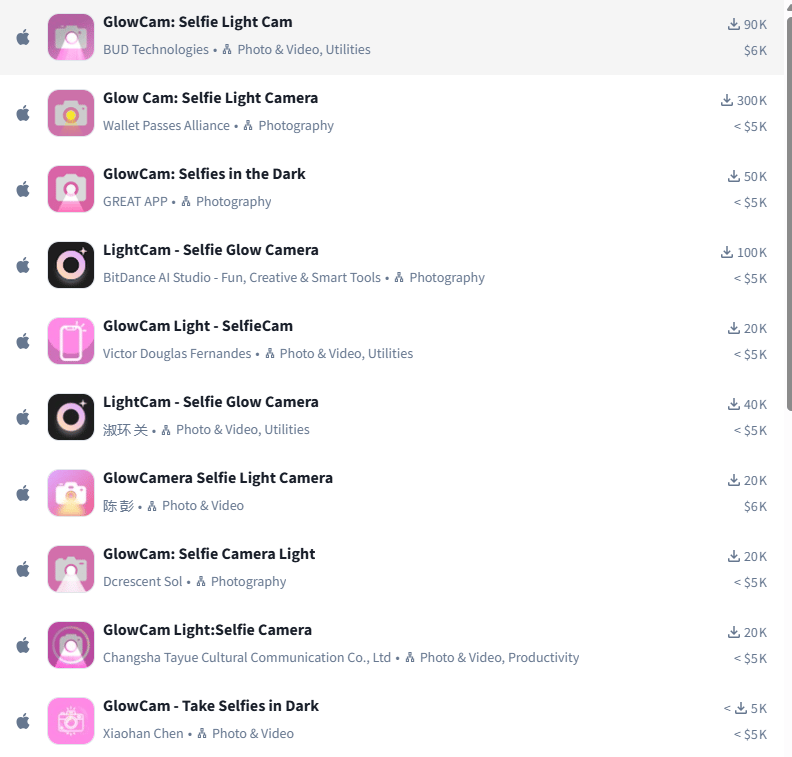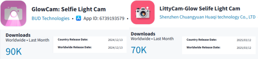 Glow Cam: Selfie Light Camera (yes, that’s a different app) tallied 300,000 downloads to GlowCam’s 90,000 last month. And it was launched in 2025.