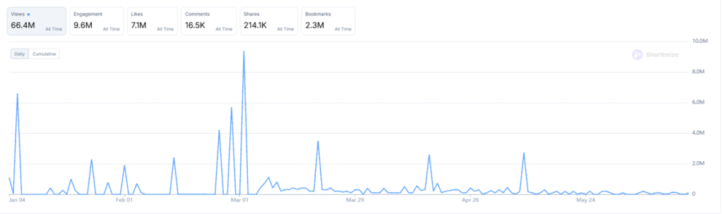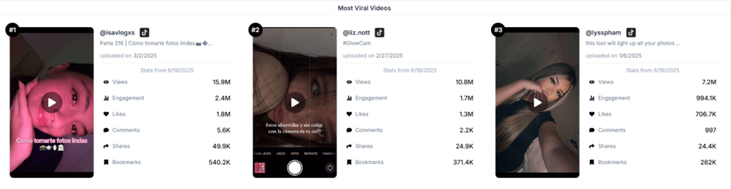 With just 37 UGC posts, GlowCam racked up 66.4 million views, 2.3 million bookmarks, and 214,000 shares. Most of those viral peaks happened early in 2025.