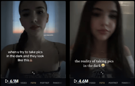 “how to take selfies in dark areas ✨” → 600K views | “the reality of taking pics in the dark” ???? → 4.7M views |