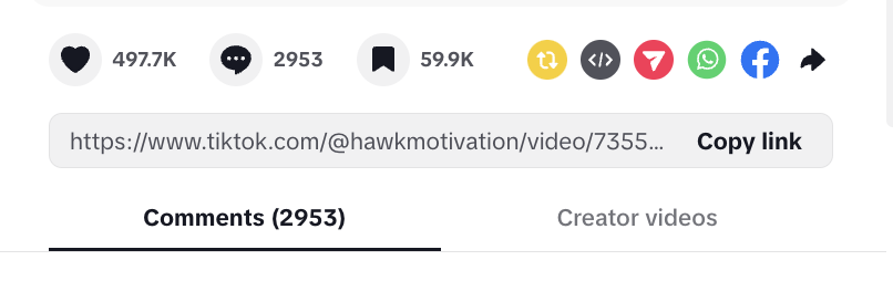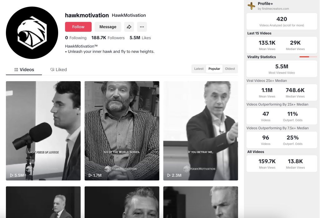 1 (tt@hawkmotivation) => 186K followers, 66M views, stopped posting July 2024