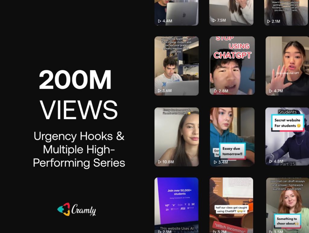 Their top-performing format is “essay due tomorrow” / “doing an essay last minute,” which racked up 40M+ views.