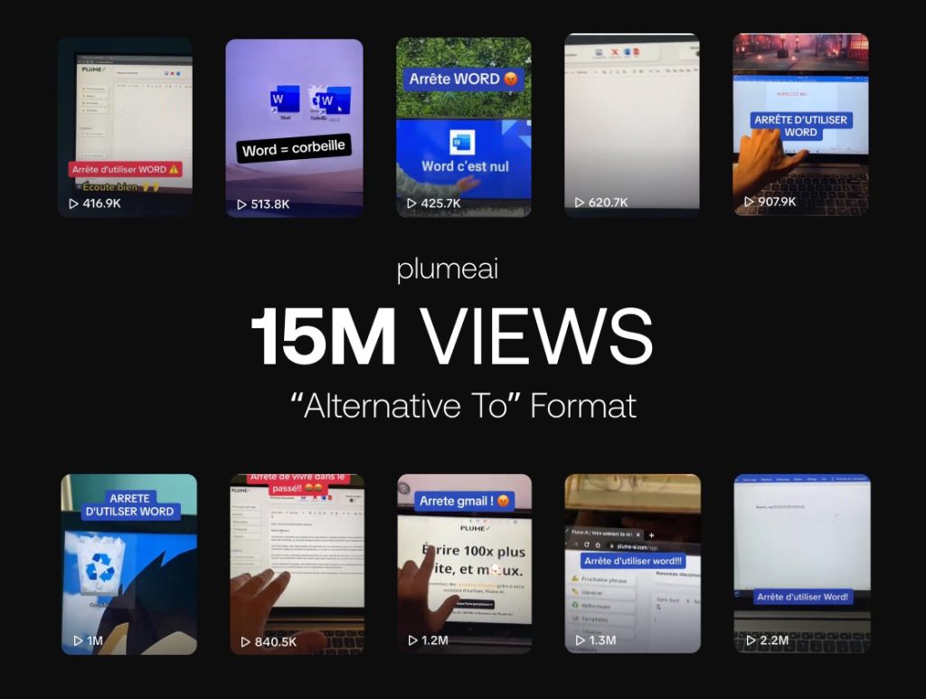 Plume is a French app, an AI-powered alternative to Google Word, and they’ve been surfing on the “Stop Using Word” hook to generate dozens of viral videos.