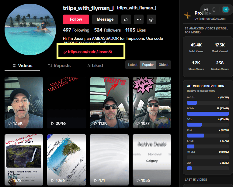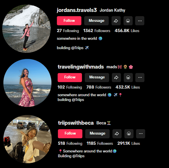 Most of the active ones don’t seem tied to the affiliate program. There aren’t any unique links or codes, just a bunch of bios saying “Building @Triips.”