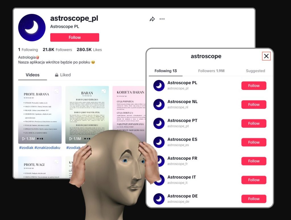 Two months ago, they created 7 different language accounts for PL, NL, PT, ES, FR, IT, and DE. And each one of them is DESTROYING. Just check astroscope_pl.