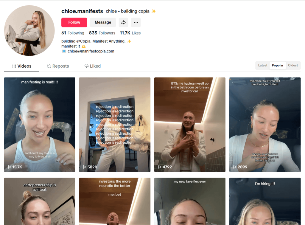 Founder, girlboss, “be like me” type of vibe => 95K views in 4 months