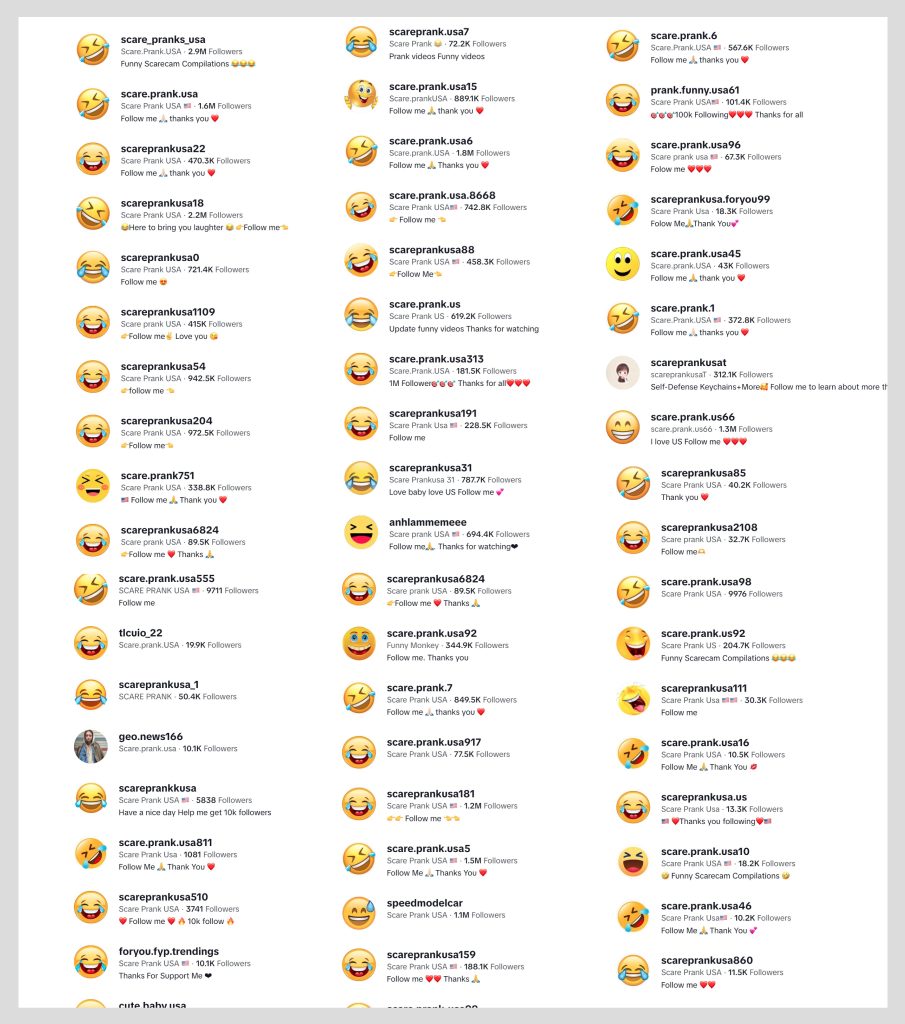 It’s prank video memes. Hundreds and hundreds of them, on each account. And hundreds of accounts.