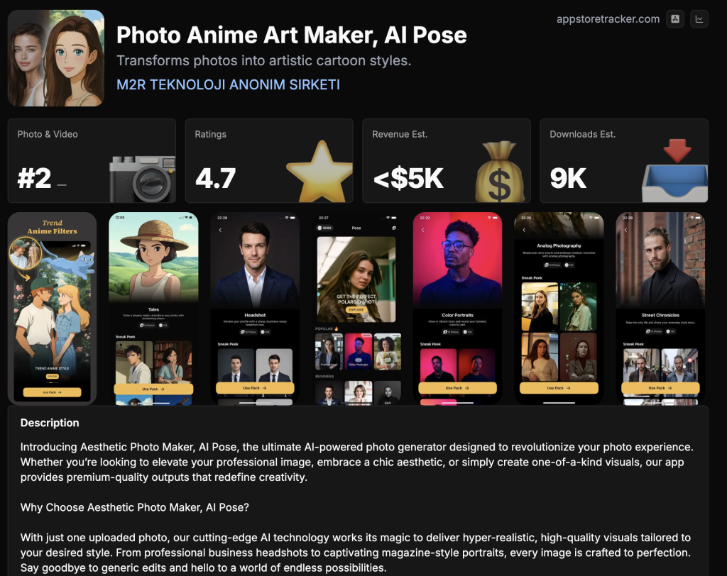 So I thought, wait. What they really do is completely revamp the app for every new trend, then use the trend’s keywords to rank as fast as possible with existing screenshots and reviews. That way, they capture all the traffic from TikTok or Reels users searching “AI Polaroid” or “Polaroid Trend.”
