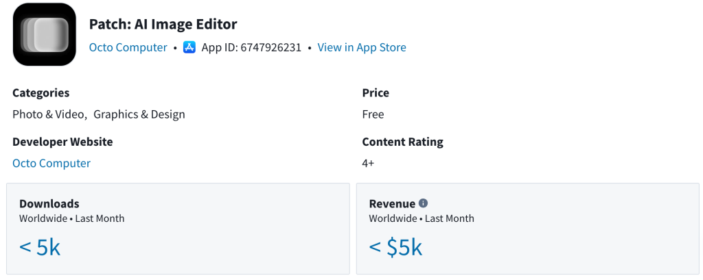 Since August, the app hasn’t posted, and both downloads and revenue remain low.
