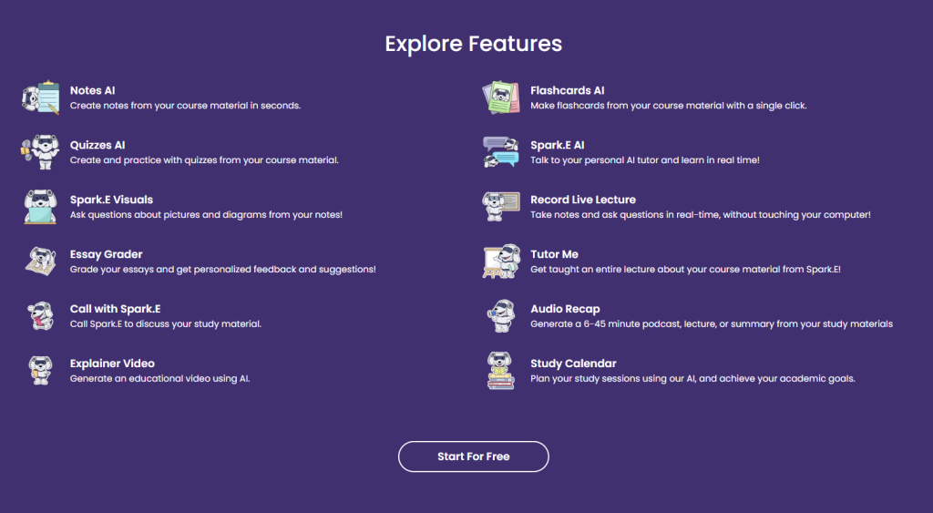 It transforms class materials into notes, quizzes, and flashcards, and includes a built-in AI chat tutor named Spark.E.