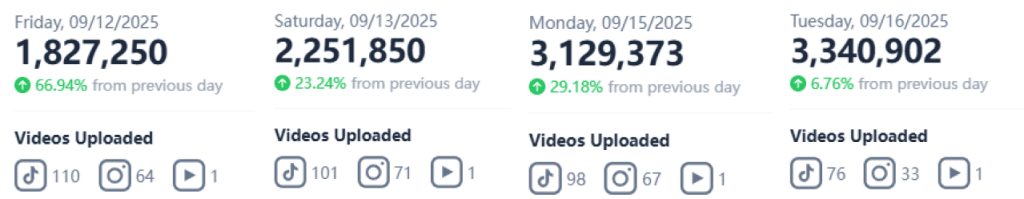 It’s a huge bet on content volume. Right now, they average around 100 TikTok videos, 50 Instagram videos, and 1 YouTube video every day. Daily views are now topping 2 million.