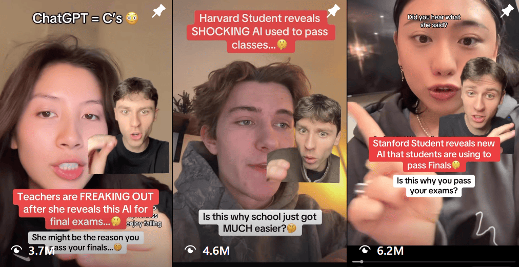 Each clip uses two stacked hooks. The first is a bold red context line like “This Harvard student” or “Teachers are freaking out” to set up the AI reveal. The second is a student-focused line like “School just got easier.”