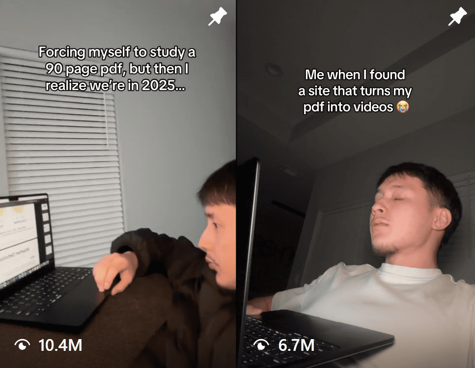 Format 1: It kicks off with a headshot selfie, then switches to a laptop screen recording that walks through the brainrot study feature.