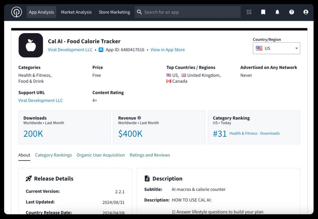 FitnessPal Calorie Counter, the giant that came in the AI calorie scanning space, does $12M in revenue and 800K app downloads. Also does targeted influencer marketing (on top of whatever other channel they run).