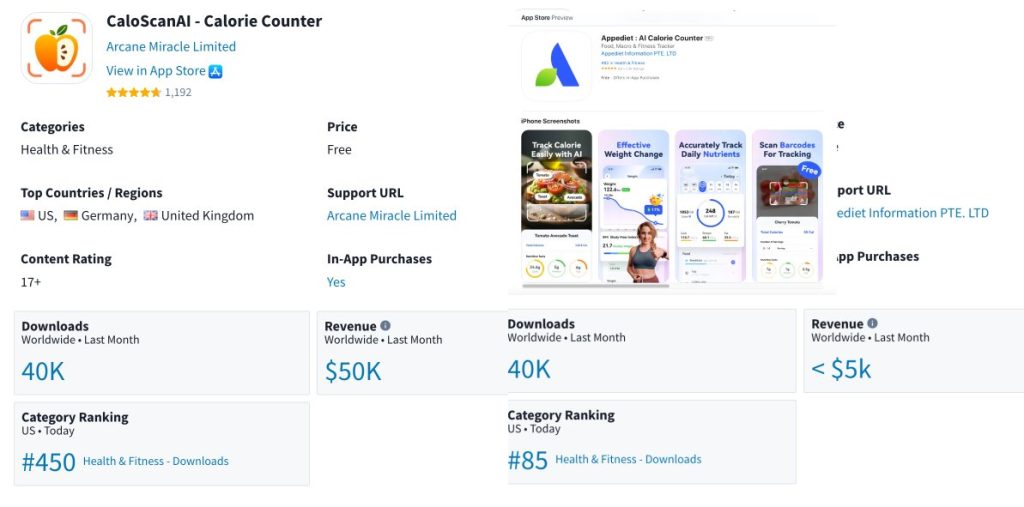 Appediet, which ranks #85, does around 40K monthly downloads. 6.5M views over their two accounts @appediet.official & @appediet. Nothing special.