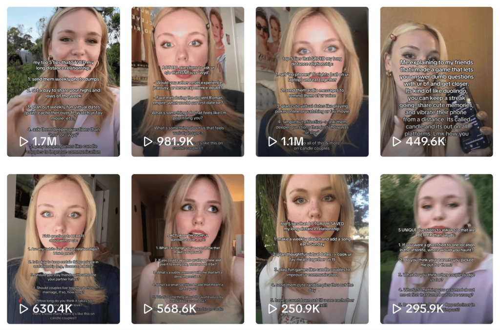 They also tried 4×4 slideshow grids on one account, and a couple of videos got over 500K views. Still, they didn’t keep going with that format.