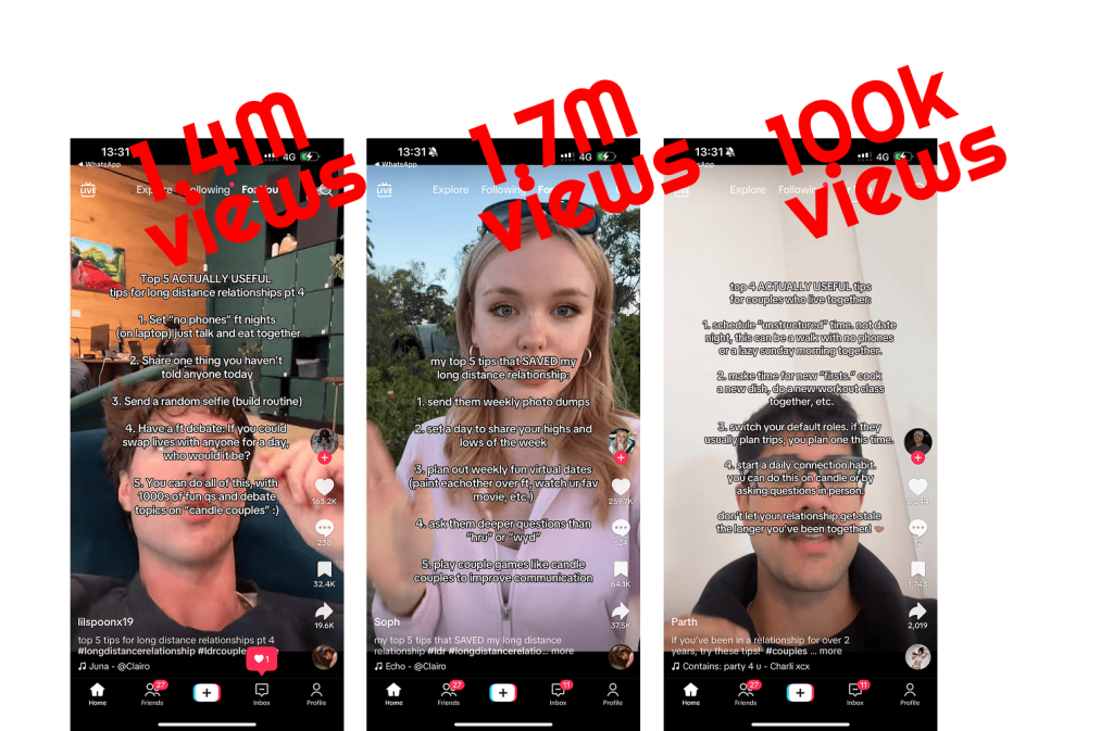 The last co-founder, Parth, got 1.8 million views, mostly from one insane trend video that did 1.3 million. We’ll get to that in a bit.