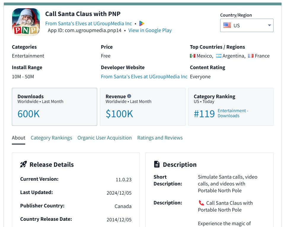 Recently came across this “Call Santa” app that has been around for 10 years and did $100K MRR last month (600K downloads).