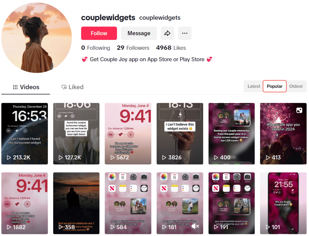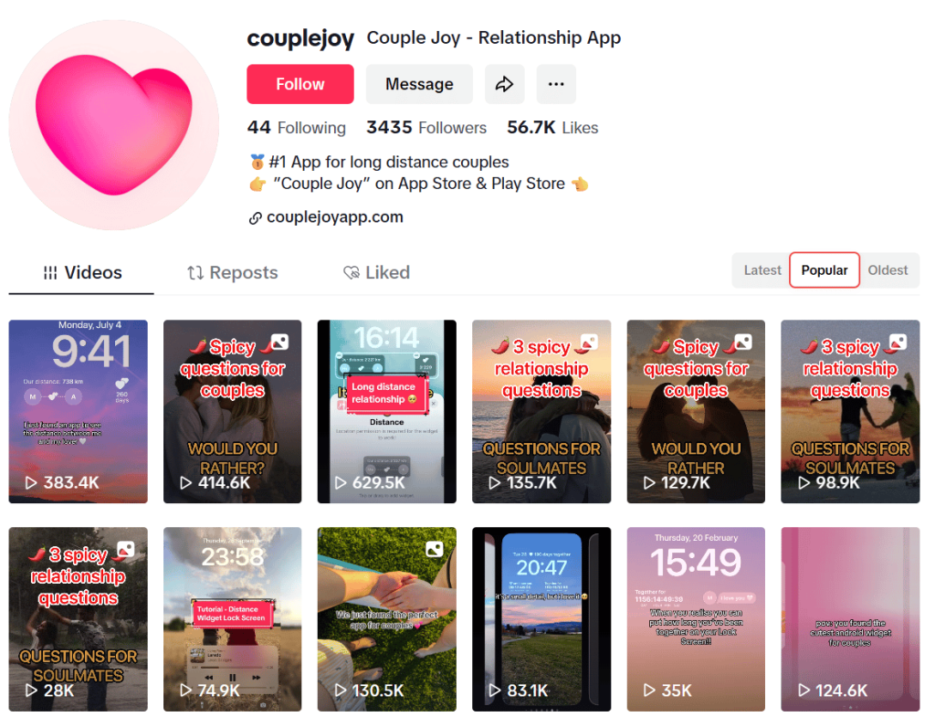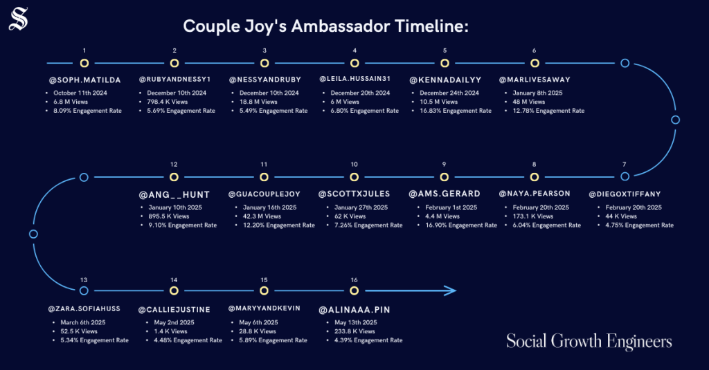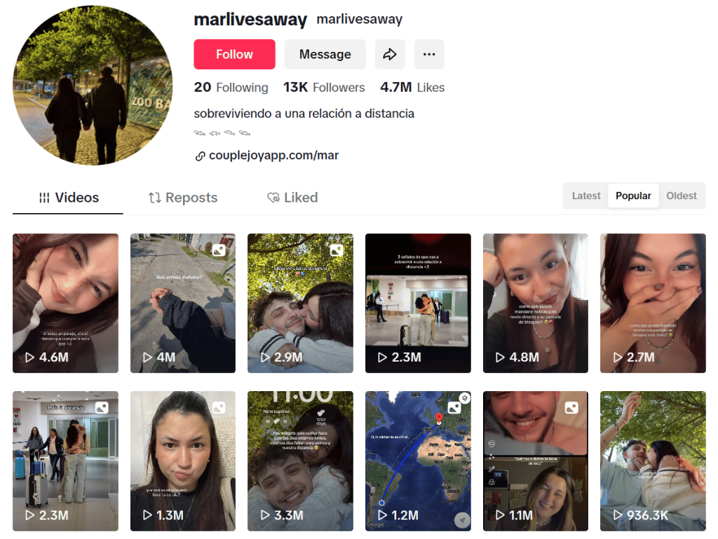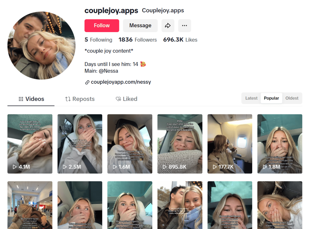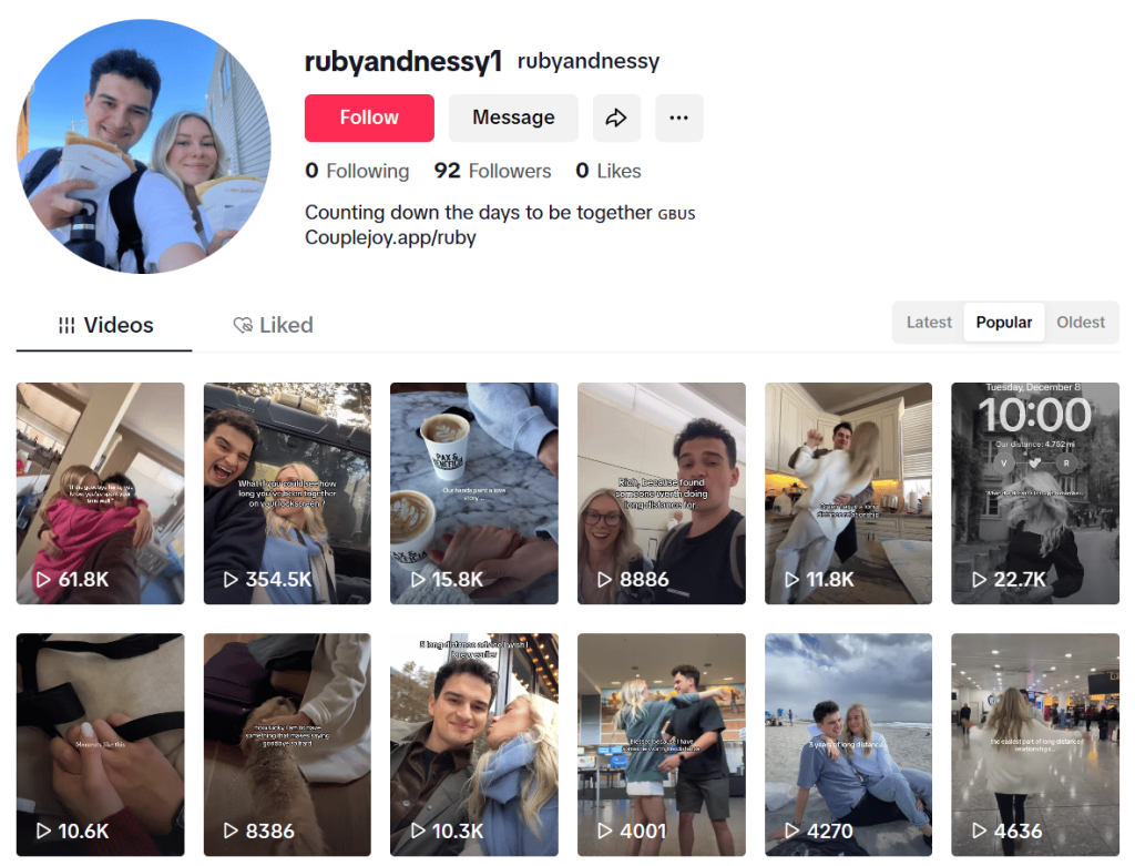 tt@couplejoy (only branded account) hasn’t posted since March 2025, totalling 3.2M views.