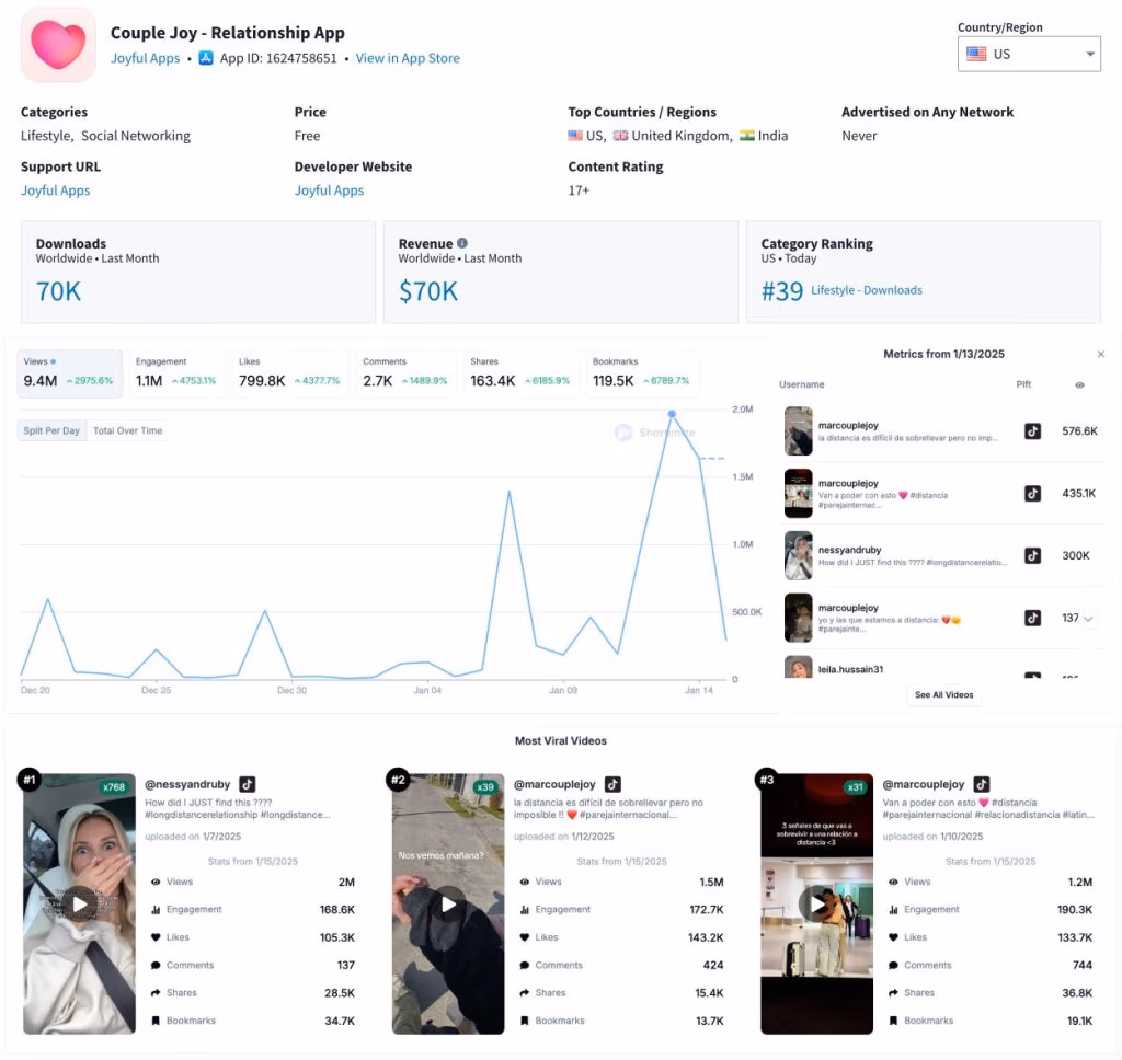 Outside, a social countdown app from 2022, hired the same creators and reused the same hooks. It gets about ten-thousand downloads a month.