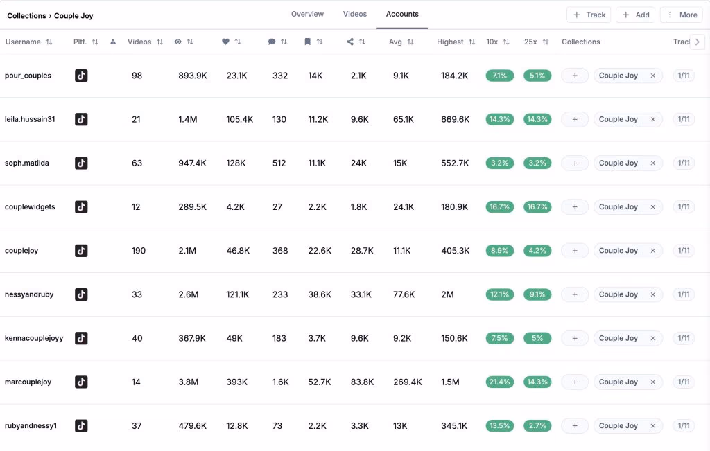 Nearly three-quarters of their 34M views come from videos that feature a couple.
