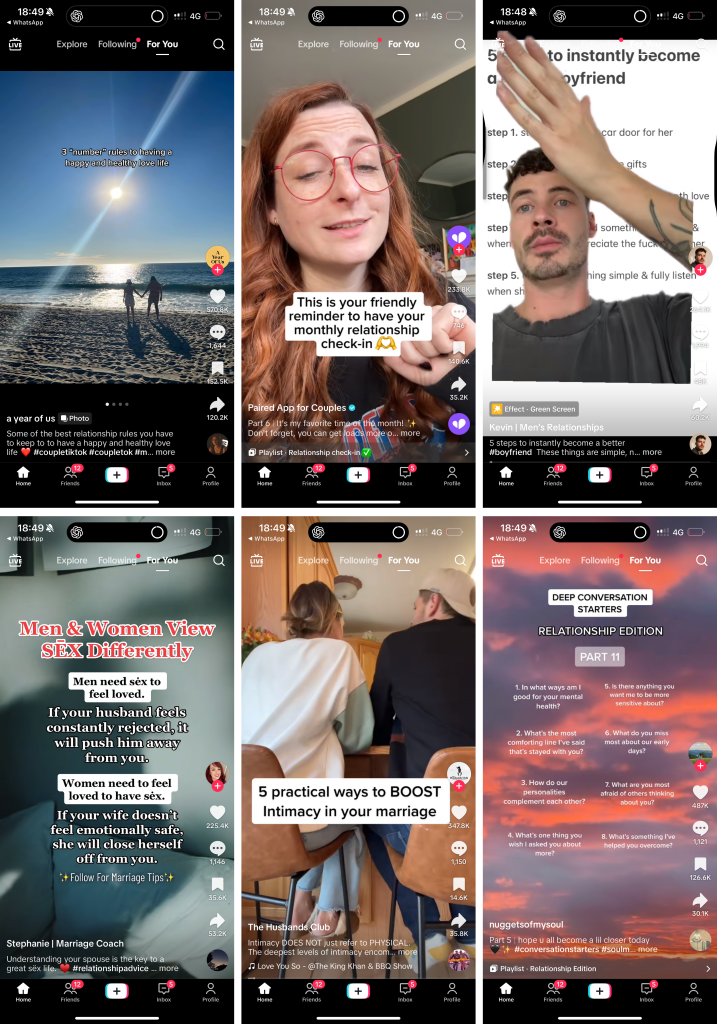 CoupleJoy runs eight TikTok accounts. Six show creators’ faces; two stay faceless. Each handle posts every day. Some clips speak English, others only French or Spanish.