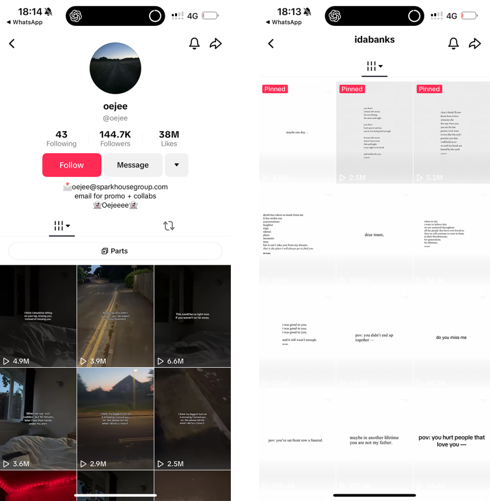 Soft Eroticism, as we labeled it, is rather big on TikTok. This account amassed 115 million views across 84 videos. An impressive ratio for a format that’s “easy to clone”: