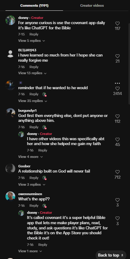 The breakout came on July 15 when tt@donivan.covenant, an account with about 23K lifetime views before the post, uploaded a 10-slide carousel telling a personal path to faith and tucked a soft CTA (app name + screenshot) into slide six.