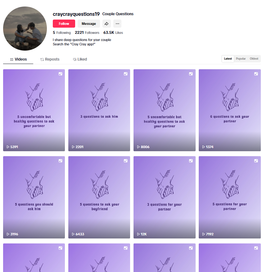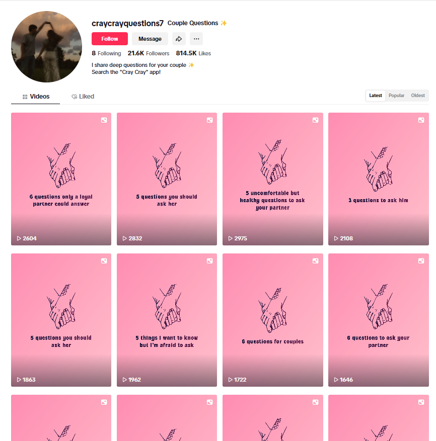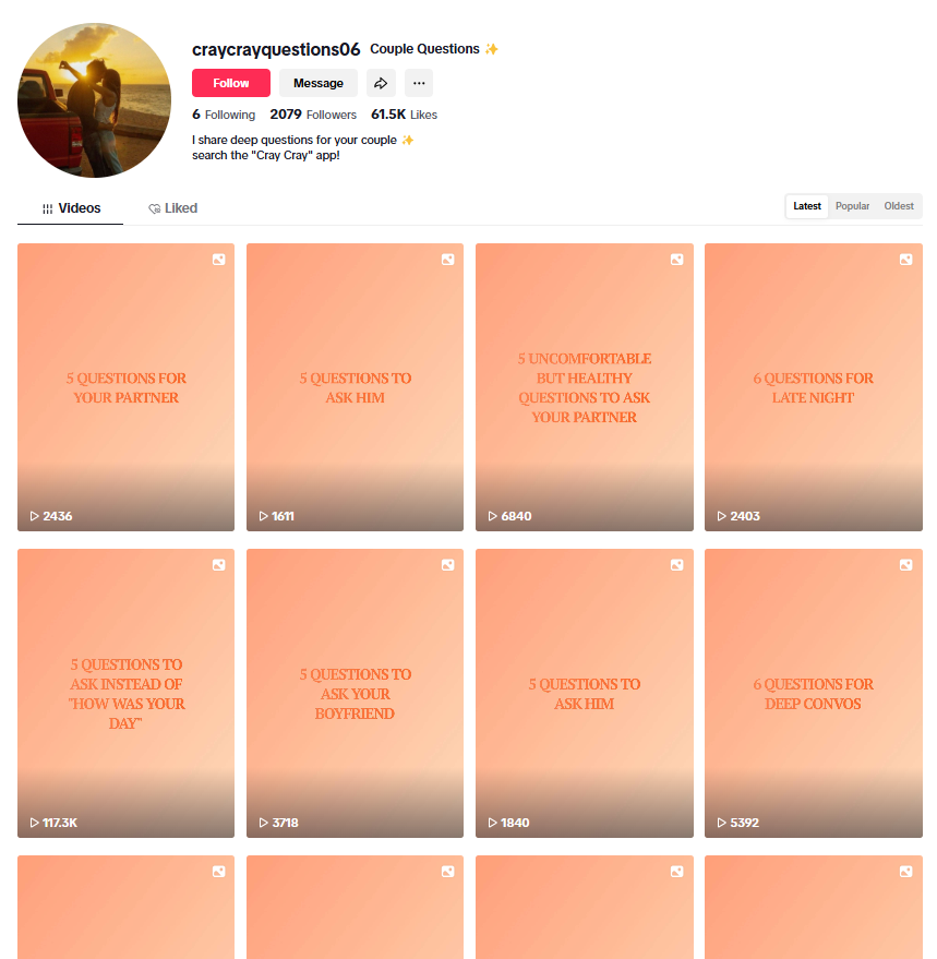 “5 uncomfortable questions to ask your other half” => 2.8M views, 114K likes, 85K saves