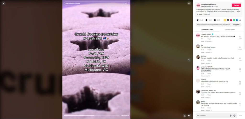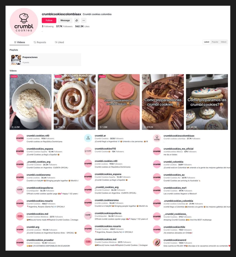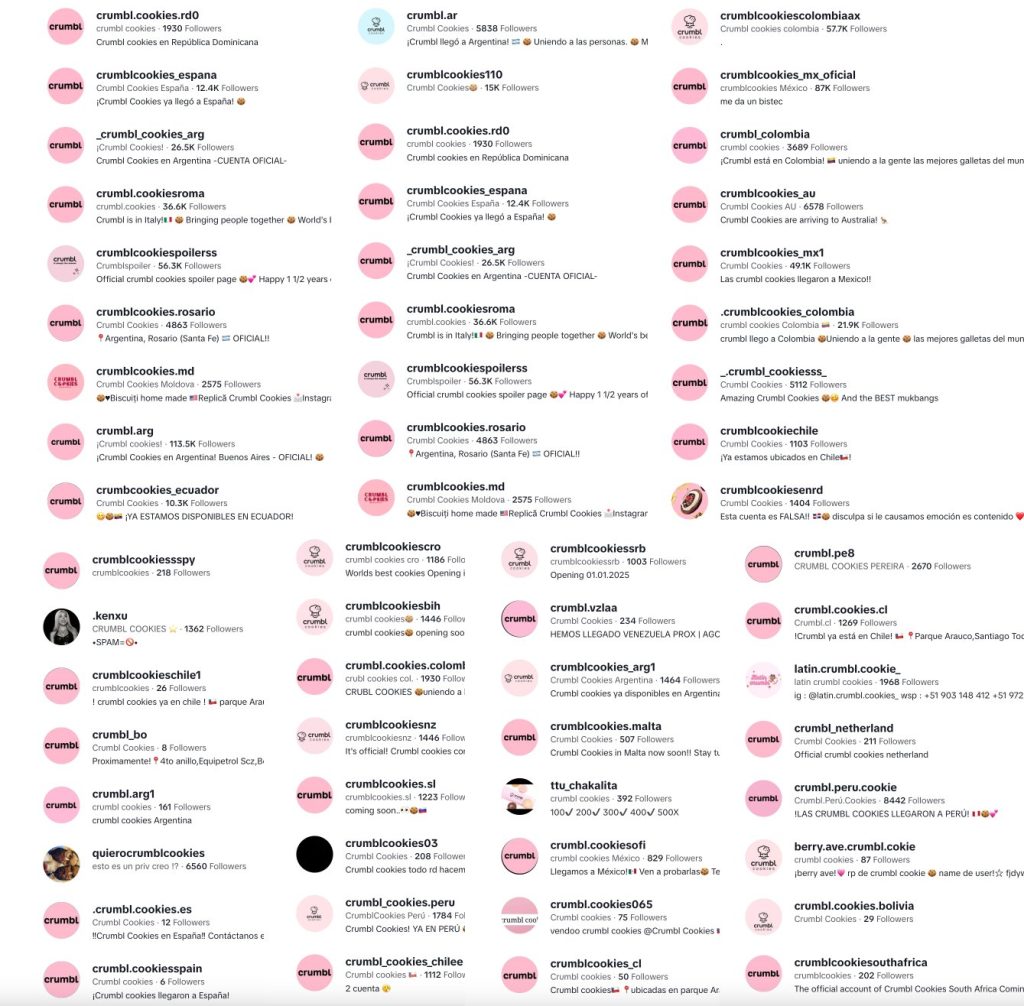 Super quickly became a huge trend on TikTok, then multiple accounts started to pop up: same names, logo, handles… Every single one was opened to announce the launch of Crumbl Cookies in a different country.