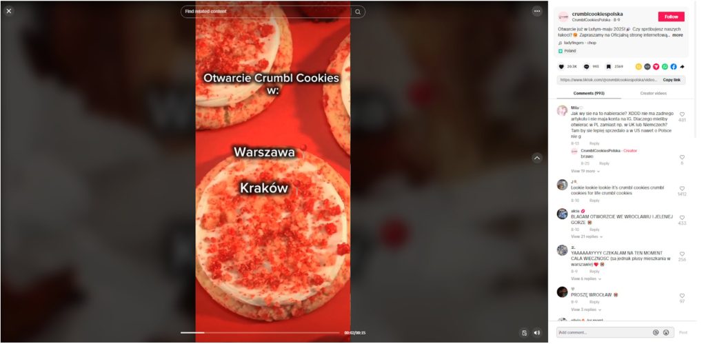 This one faked a Crumbl Cookie release in Poland. Less than 3K followers, only 3 videos on the page, but: 1 video = 326K views + 20K likes + 1K comments + 2K saved.