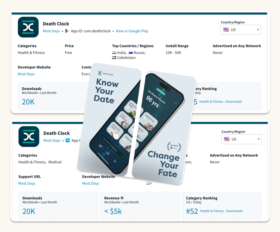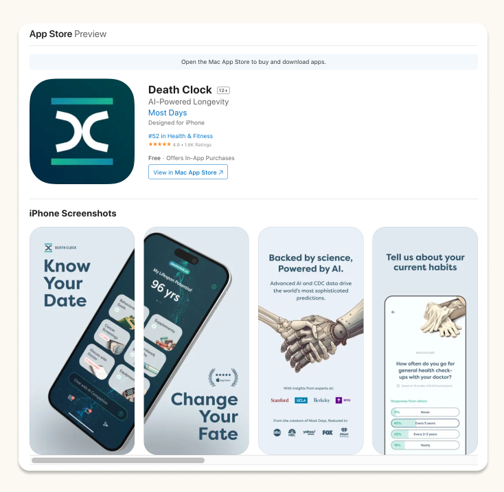 They got over 40,000/mo downloads since May. They’ve reached 4.3M views on TikTok in 4 months (@deathclockai). And on IG Reels they got 7M views (@deathclockai).