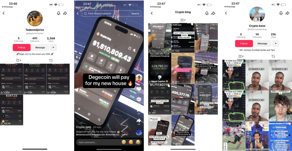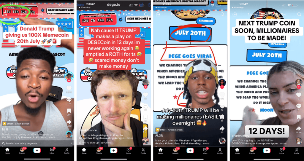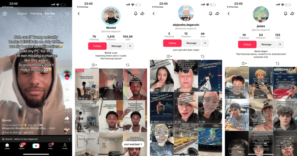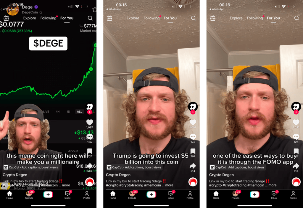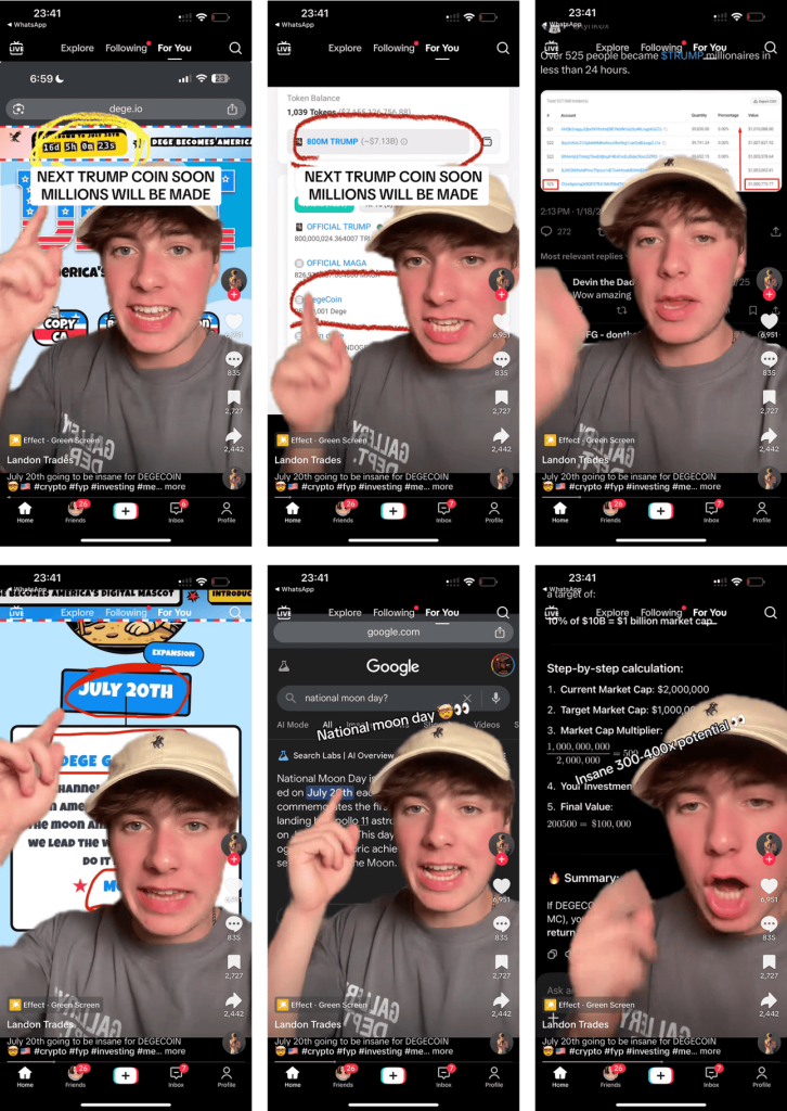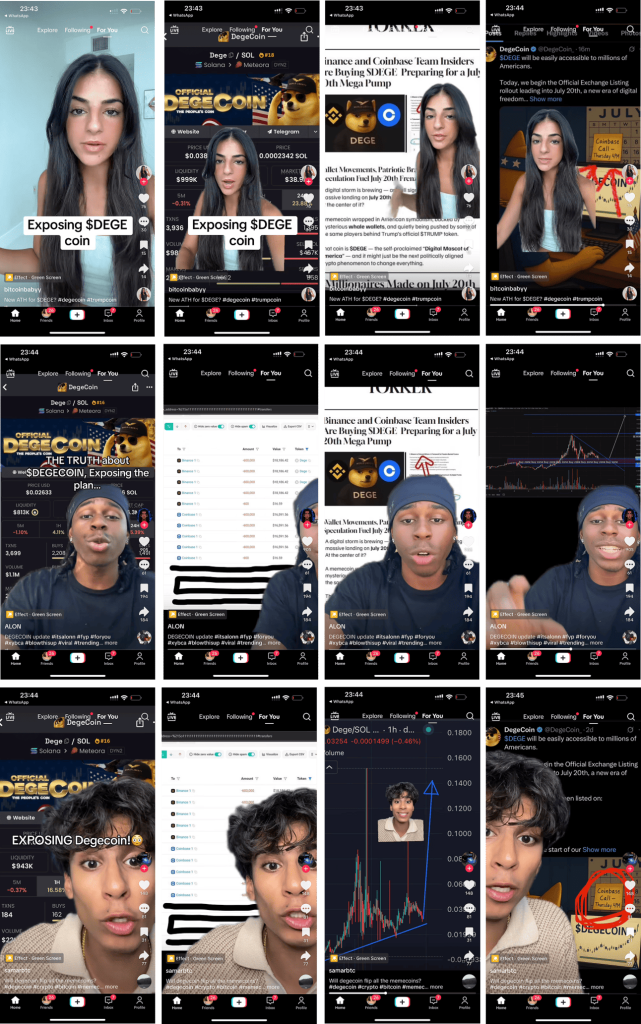 They run or hire whole accounts that crank out faceless clips like “Day 3 of posting DegeCoin until we become a millionaire.”