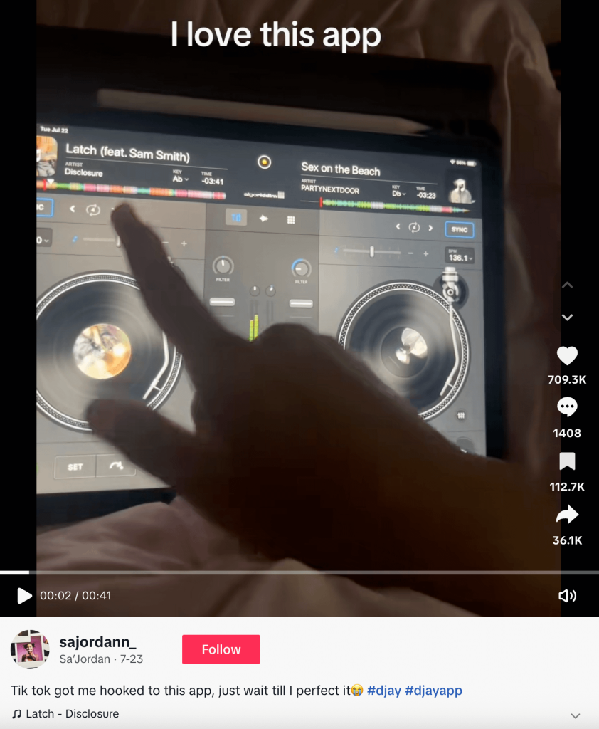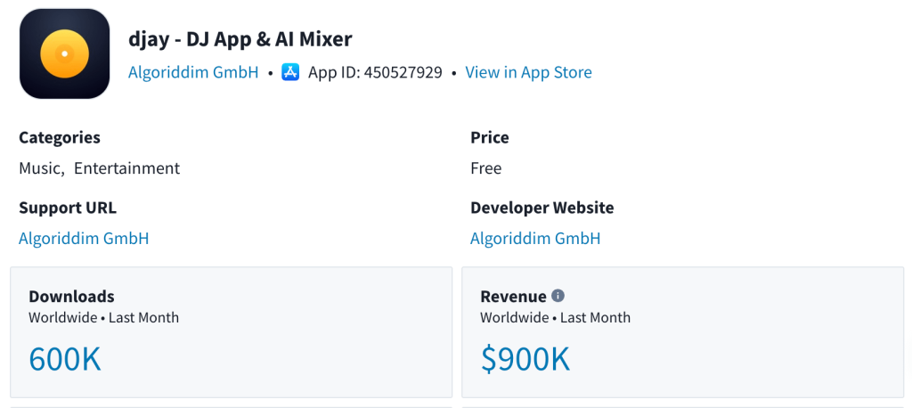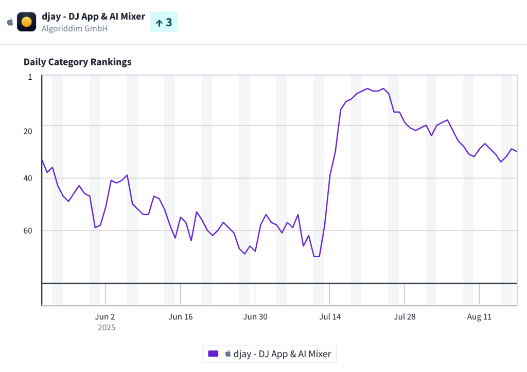 Djay is a decades-old DJ app that has now suddenly exploded on short-form video. Riding its AI mixer feature into a massive organic reach, they’re climbing fast on the App Store recently.