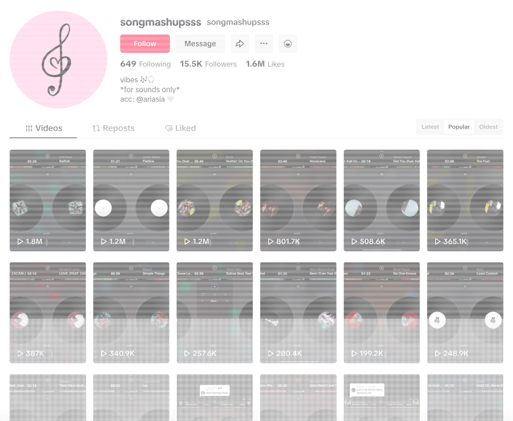 The same pattern repeats across accounts: a random mix of low-performing posts, one DJay clip breaks, and the account doubles down. Hundreds of millions of views appear to have come from this collective, mostly organic, activity.