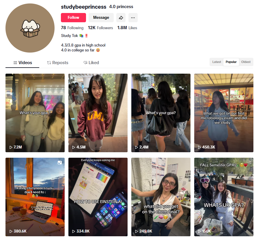 tt@studywithlisaaa => 3.4M views over 26 posts (avg of 129.7K views)