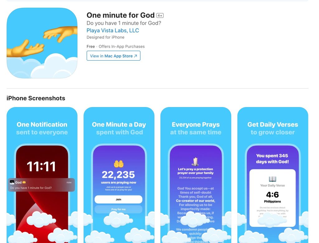 The group behind these apps seems incredibly fast at launching them. Rayz in July, Demure on August 20, and One Minute for God on Sept 1. Demure is a female-oriented version of LooksMax, while One Minute for God might have been created to ride the ChristianTok niche: