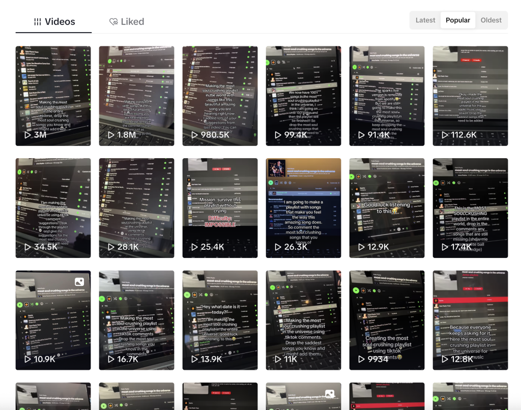 His playlist already has 6.5k saves and he only started a month and a half ago.