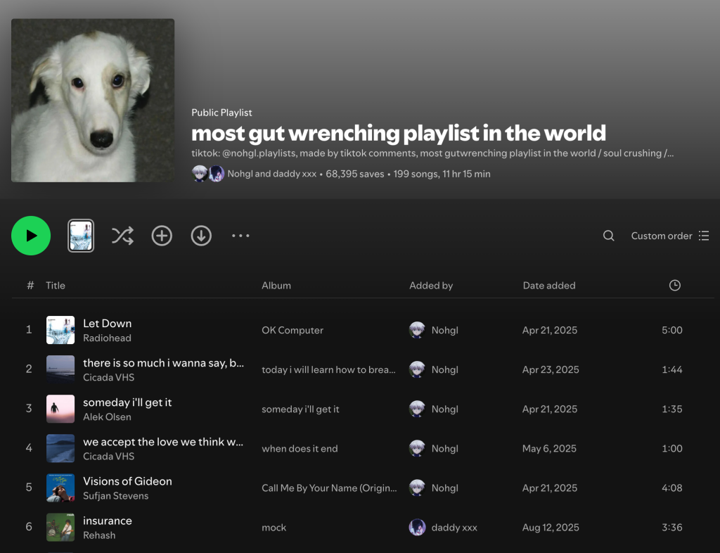 The hook is: “Making the most soul-crushing playlist in the entire universe, drop the most soul-crushing songs you know and I might add them…”