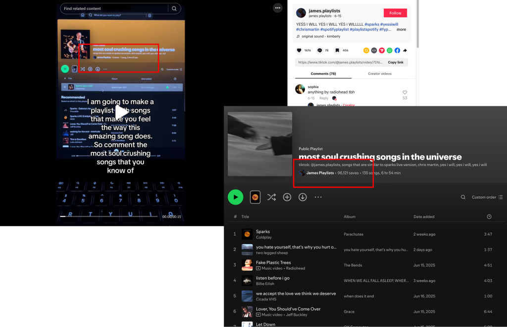 Those three independent accounts are running the exact same faceless strategy, recording their laptops and driving users to Spotify playlists.